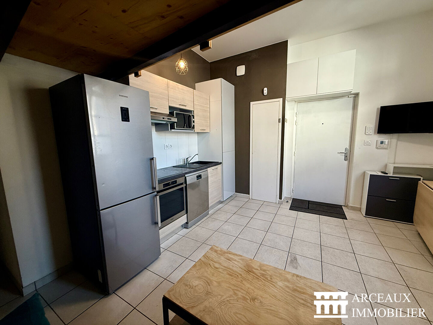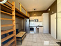 Coin cuisine équipé aménagé ouvert sur pièce de vie avec grand lit en mezzanine.